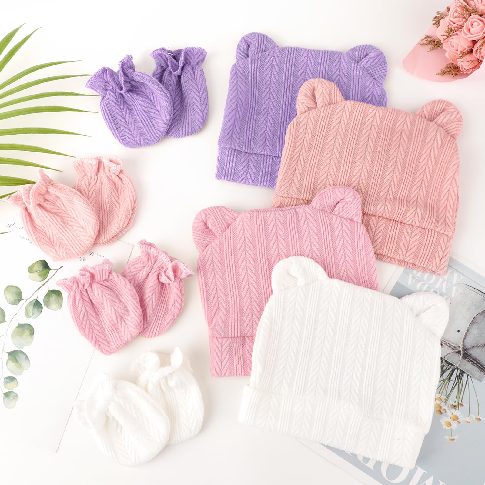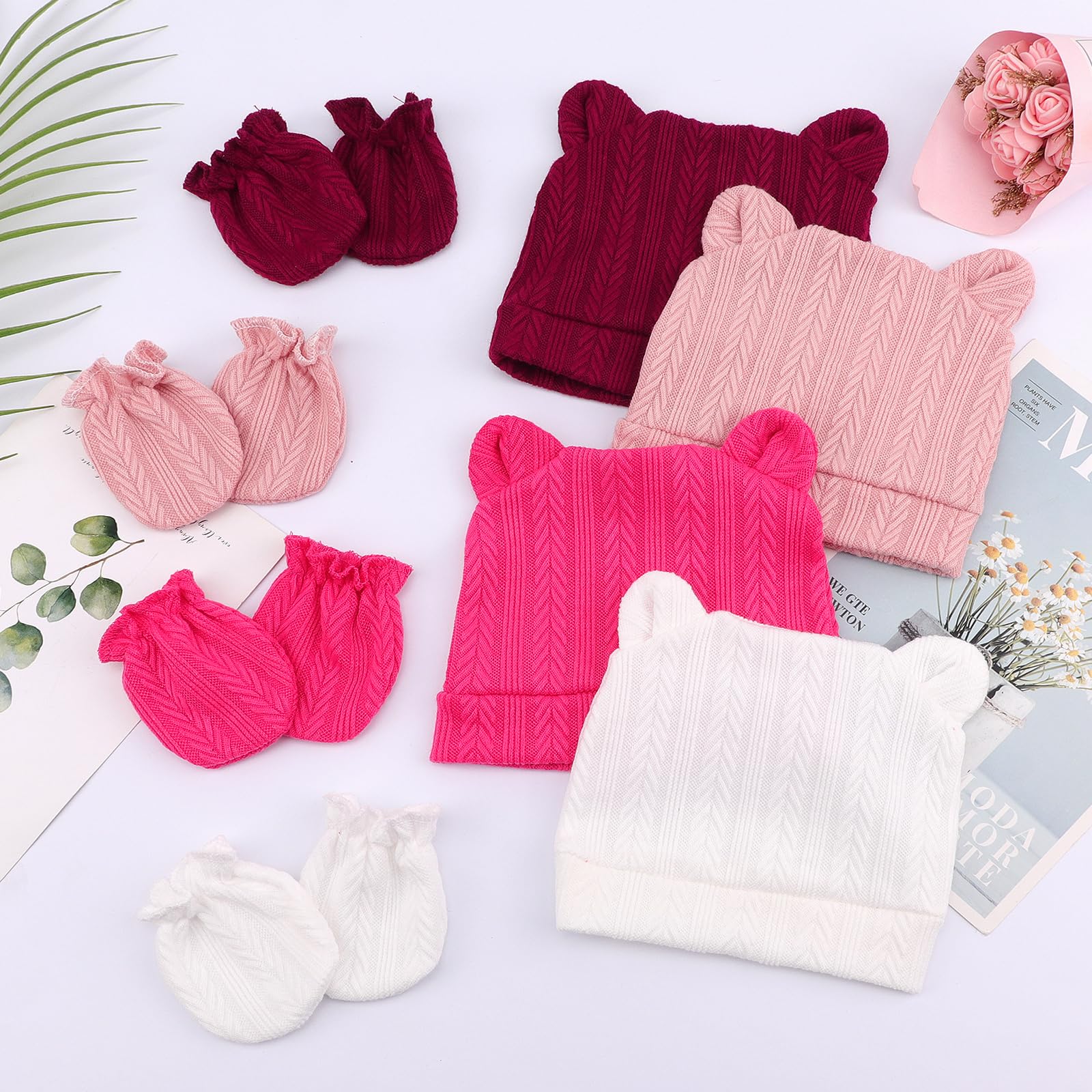 4 Set Baby Beanie Hat + Gloves (0-6 Months)