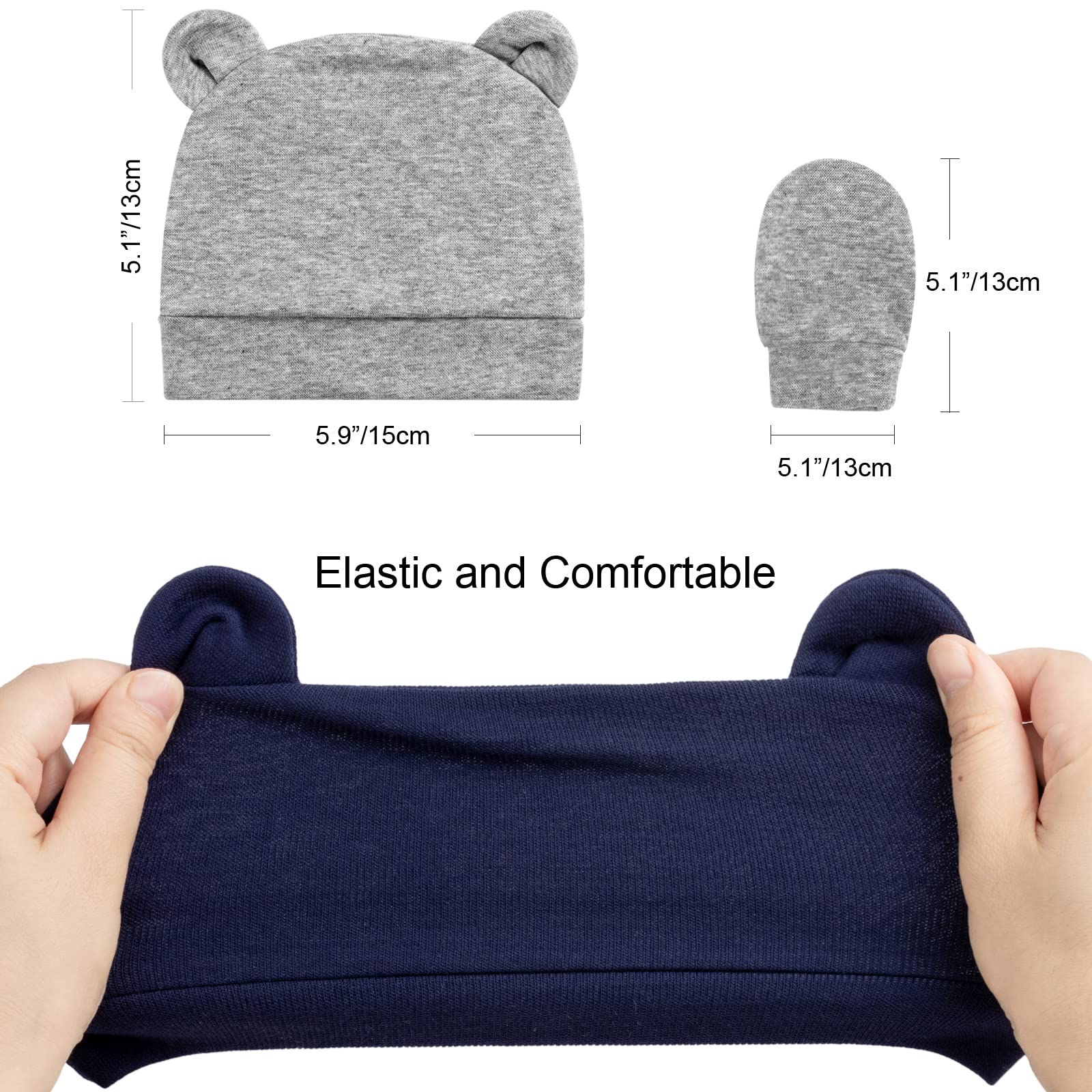 This adorable 4-piece newborn set from The Bambinos includes soft cotton baby hats and matching mittens, designed to gently protect your baby’s delicate skin. Crafted from a breathable cotton-spandex blend, the beanies stretch comfortably as your baby grows — offering the perfect fit from newborn to six months.